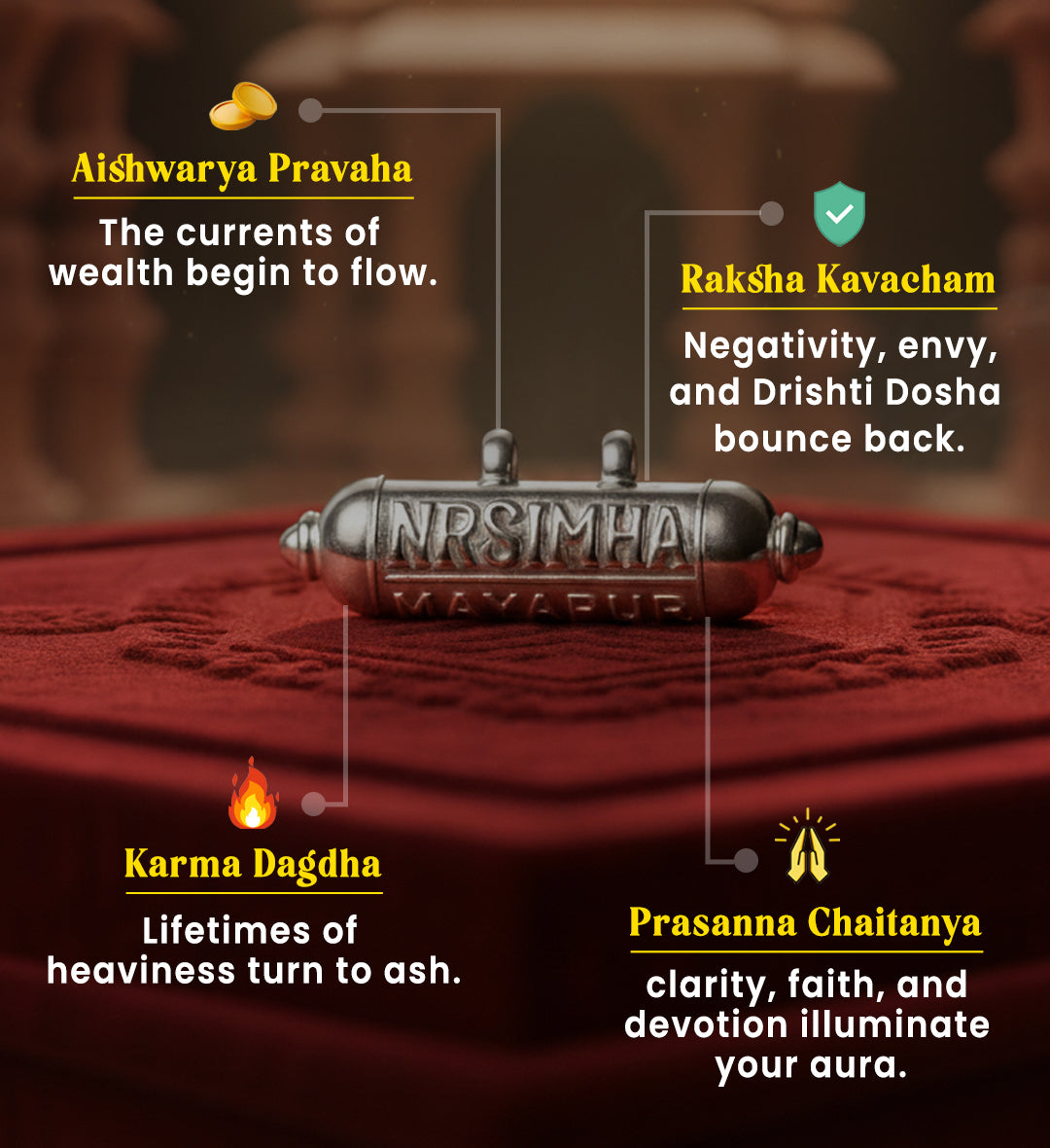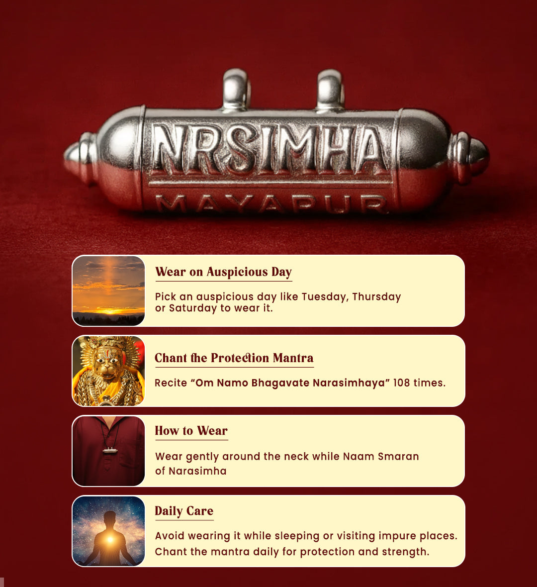 This is no ornament. It is a living Yantra, a Divya Raksha Kavacham, hand-energized in Mayapur, the abode of Ugra Narasimha Deva.