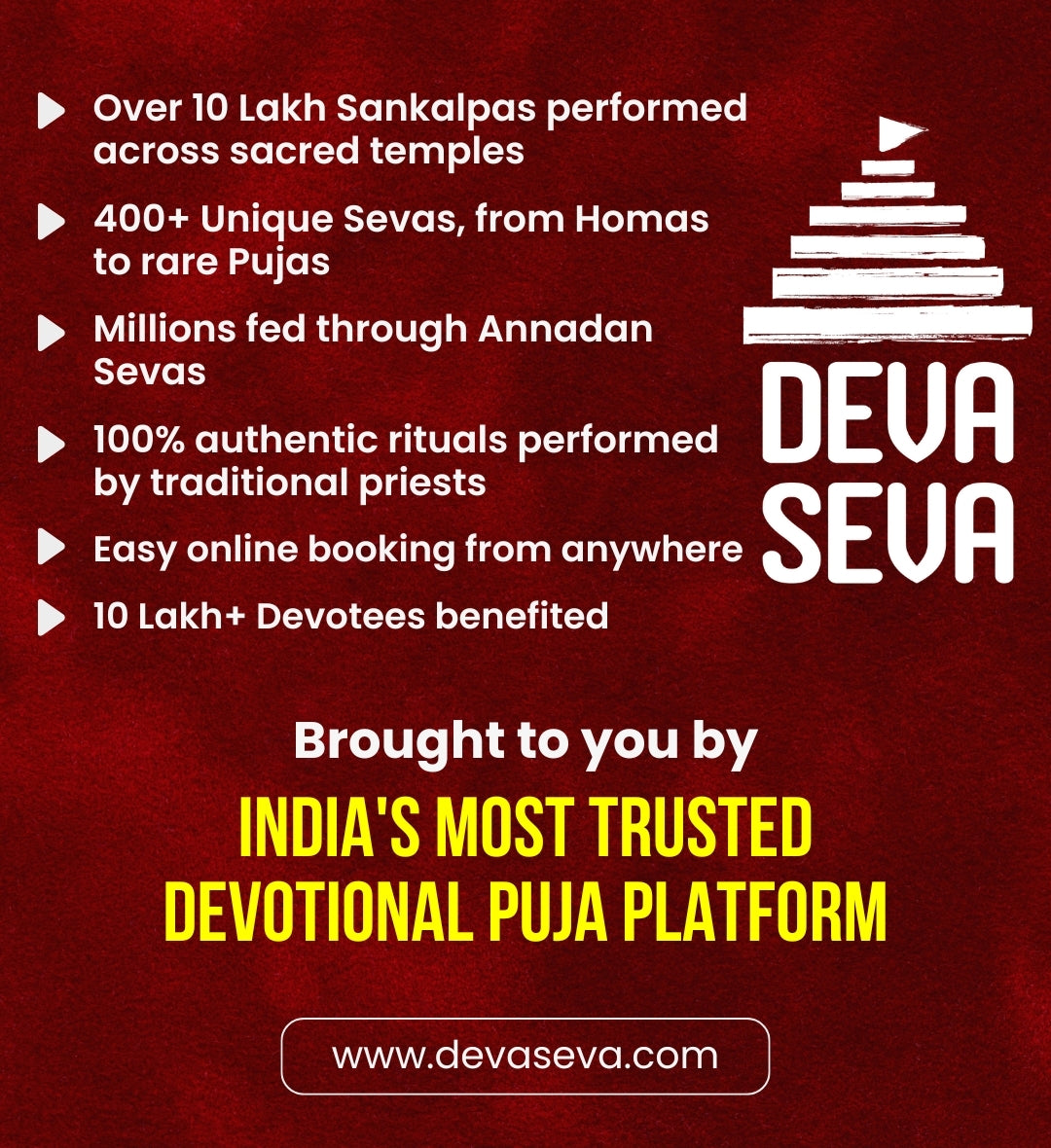 Over 10 lakh+ devotees across Bharat and abroad now trust DevaSeva for their sacred journeys — from live pujas and vratas to divine prasadam and energized spiritual items.
